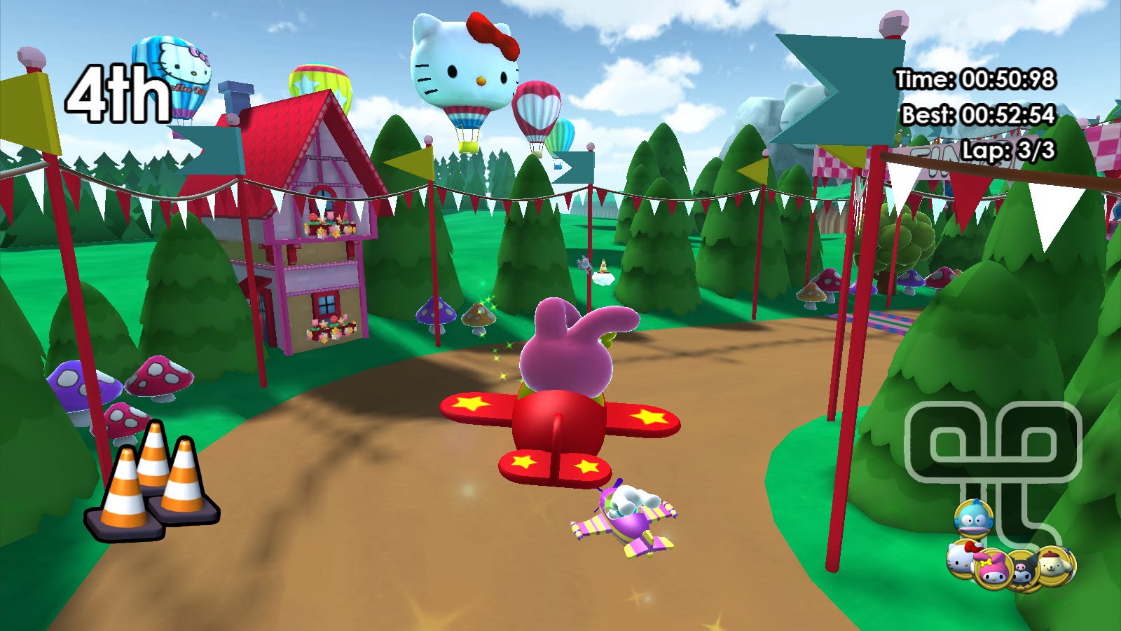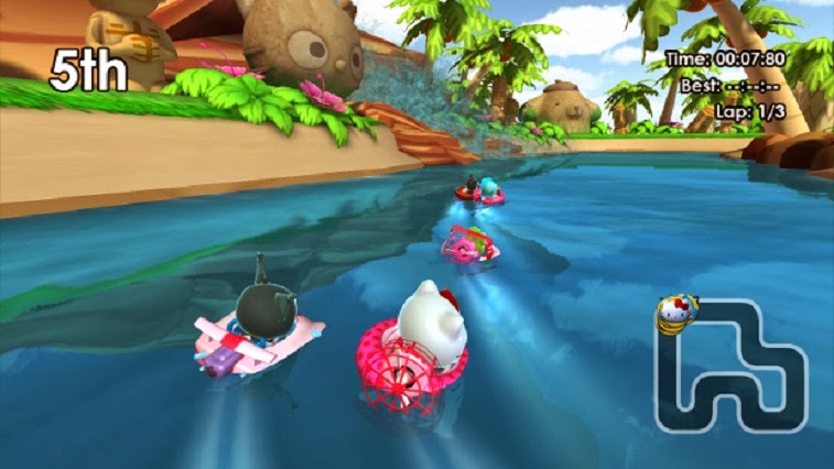 The racing itself is simple, as you’d hope for a game that children need to be able to play. Track design is very basic, there’s no powerslides, and the items are all very standard for a kart racer. This all works in the favour of the game, which is meant to be a lighthearted and basic kart racer. But then the plane sections happen. Yep, just like the recent Sonic kart racer there are plane and boat sections to go with the road action, but the plane sections in this Kitty game are truly unbearable, with shocking physics and unresponsive controls. The road cars work fine, and the boat steering is clunky but manageable, but the plane sections would be unplayable if the turns and tracks weren’t so basic.